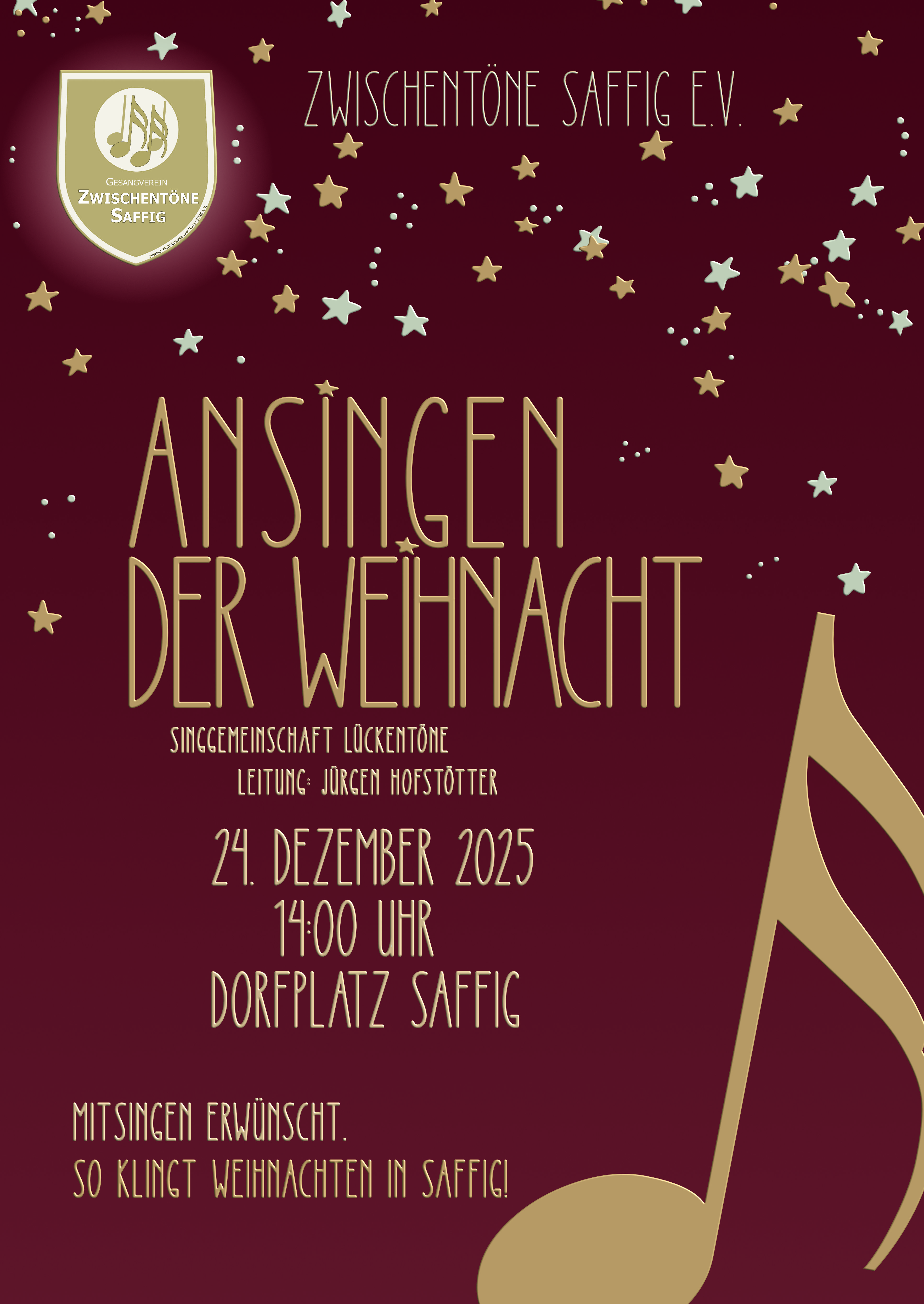 Beschreibung:Der Gesangsverein Zwischentöne Saffig e.V. lädt alle Bürgerinnen und Bürger sowie Gäste herzlich zum traditionellen Ansingen der Weihnacht am 24. Dezember 2025 um 14 Uhr in Saffig ein.